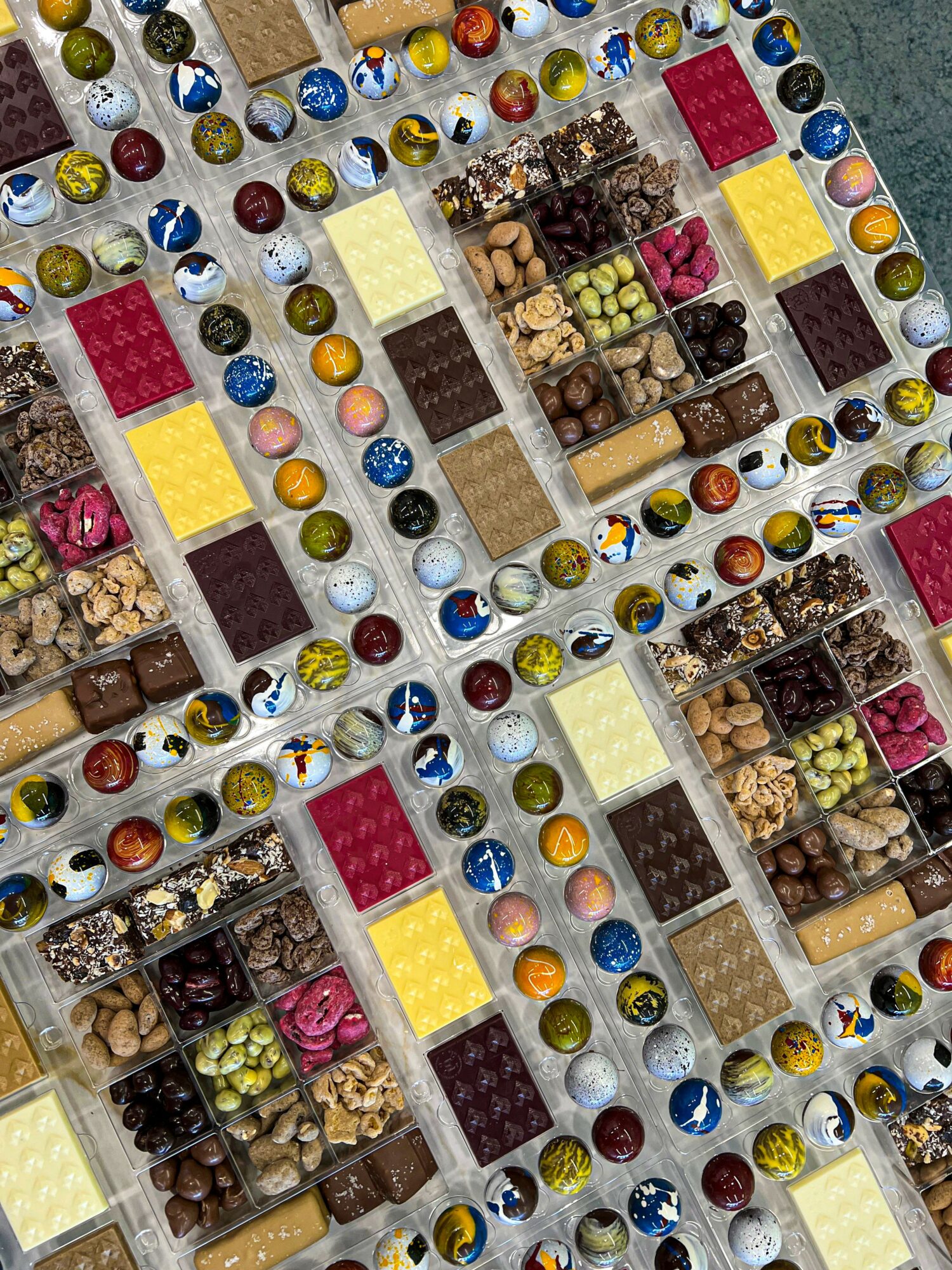 What sets us apart is that everything is made entirely in-house, under one roof. We source premium cacao, transform it into chocolate through our bean-to-bar process, and use it to craft hand-painted bon bons, chocolate bars, pâté de fruits, dragees, platters, and seasonal pieces. Every color, texture, and flavor is intentional, and no two pieces are ever exactly alike.