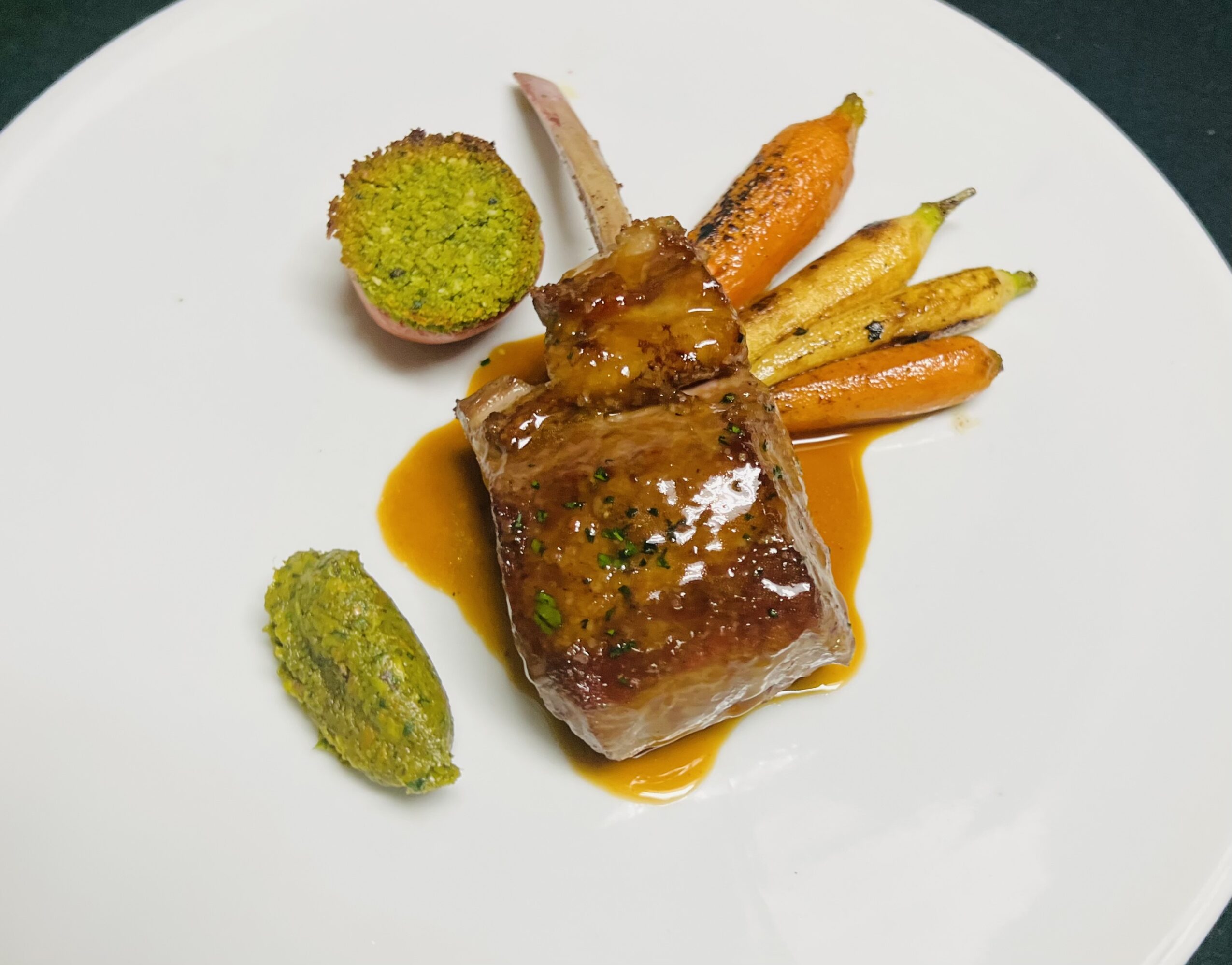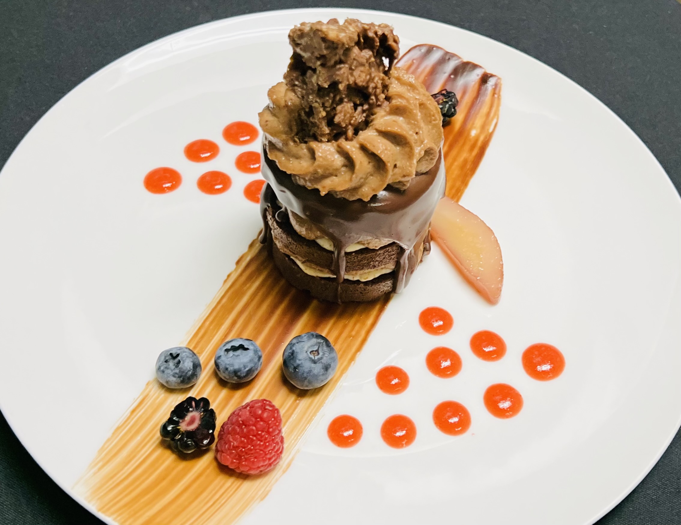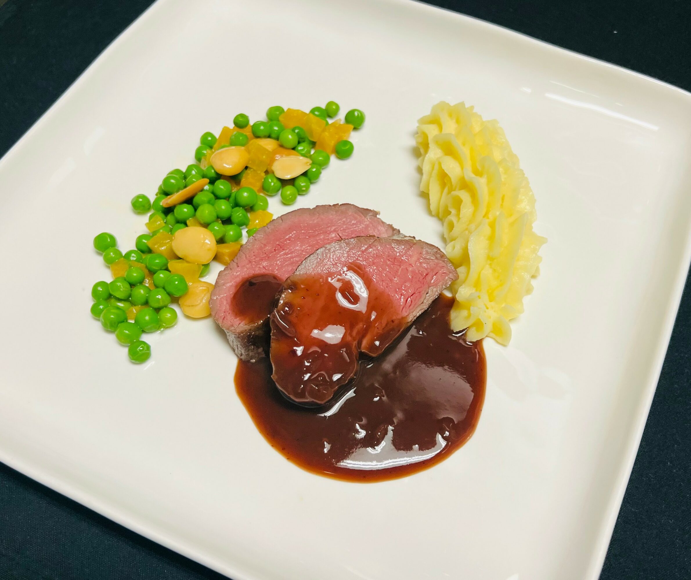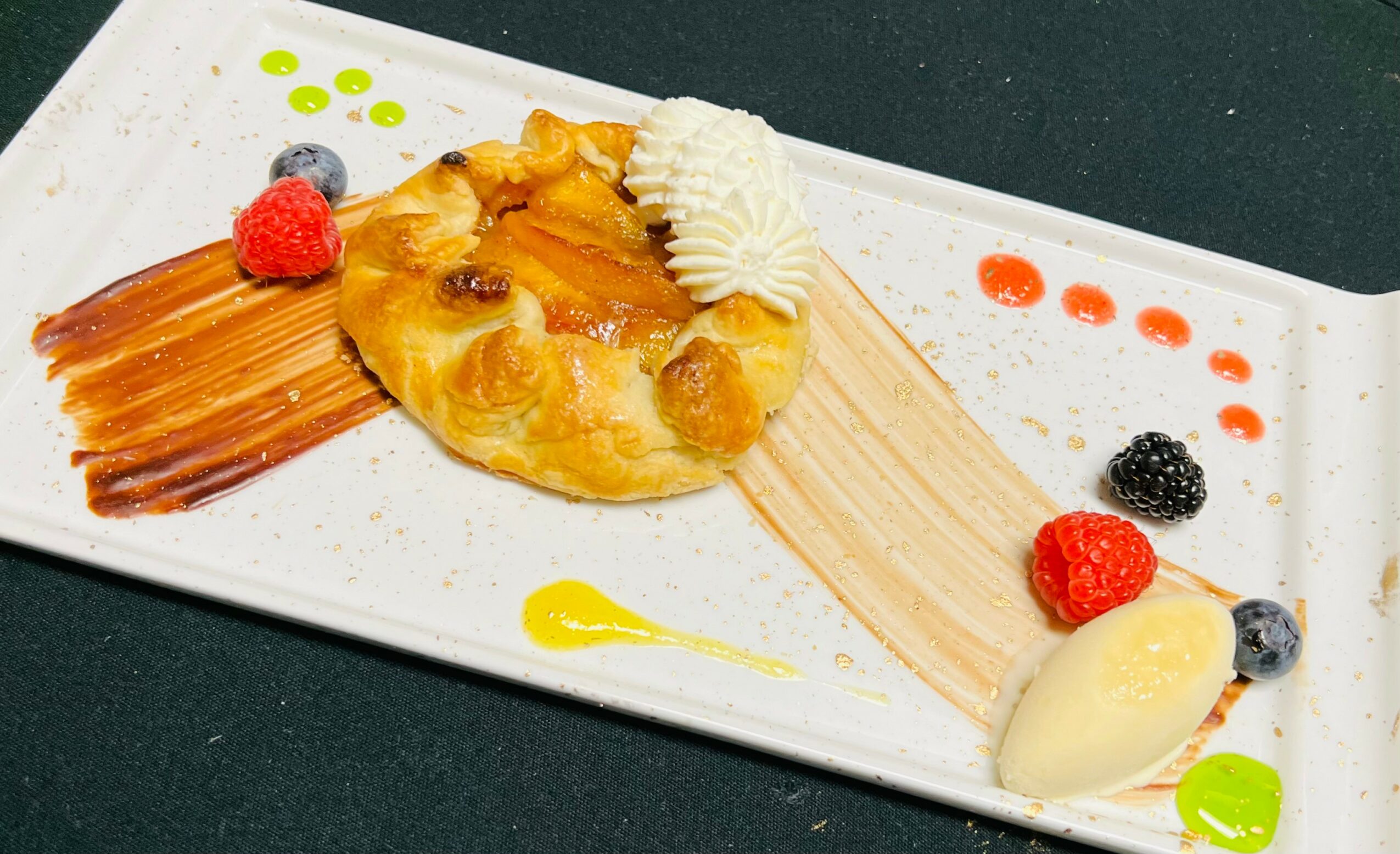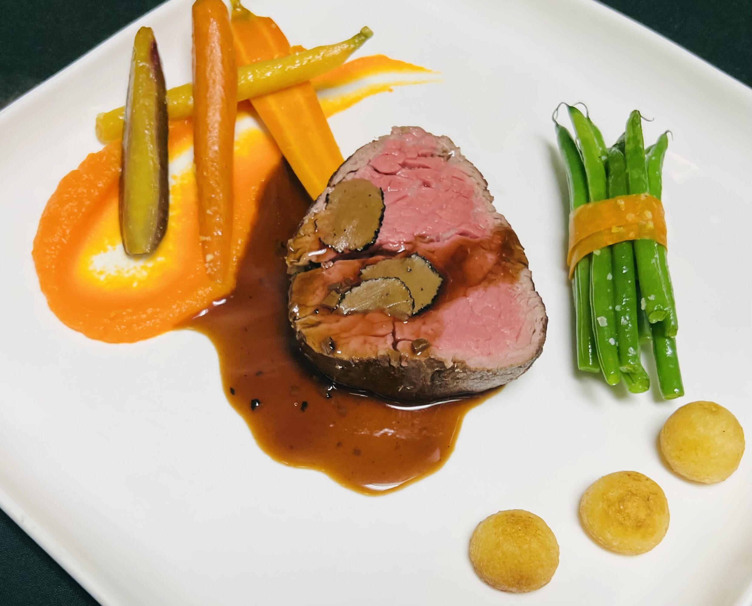 We serve a set menu, starting with plated hors d’ouevres and a glass of sparkling wine. The next course is soup; we always offer lobster bisque, and then switch the vegetarian soup seasonally. We then move onto a seasonal salad, followed by a house-made sorbet intermezzo. For entree, we have 5 options: Tenderloin of Beef, Rack of Lamb, Braised Beef Short Ribs, Duck Breast, and our Fresh Catch of the Day. And then we have three desserts to choose from. We always offer Apple Pie, and then the other two choices change seasonally.
