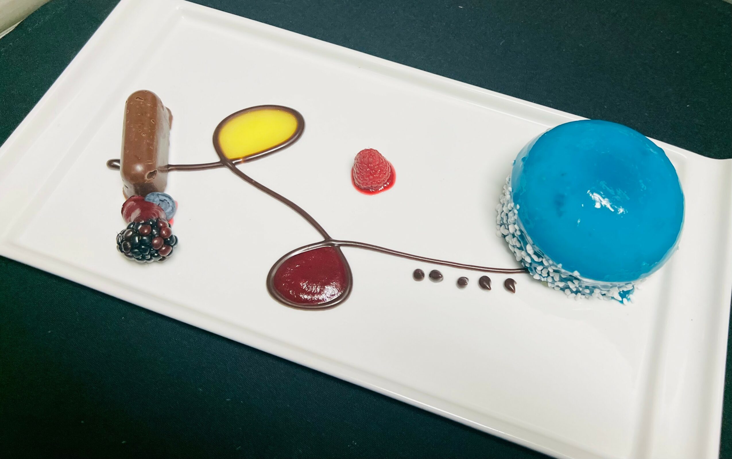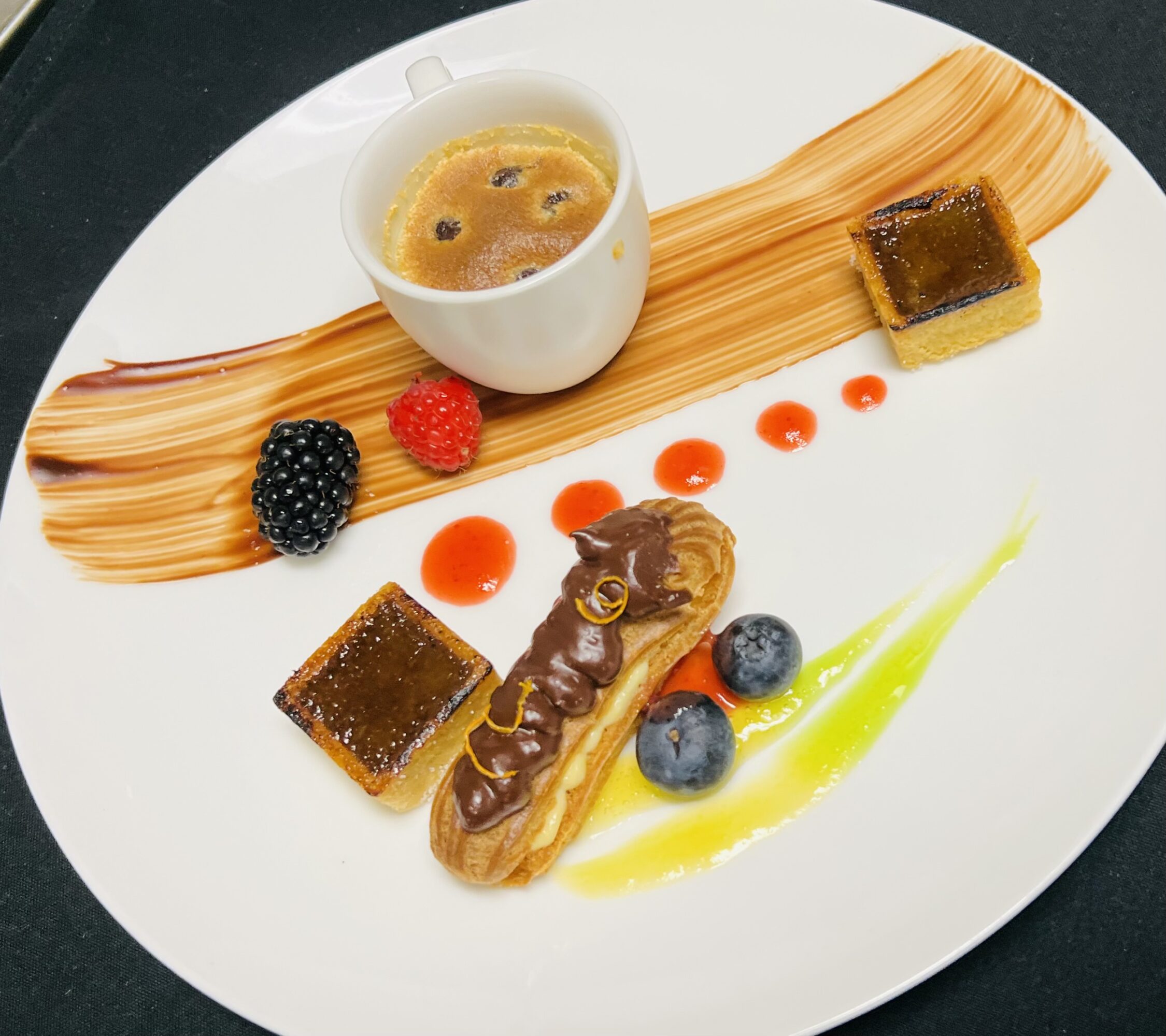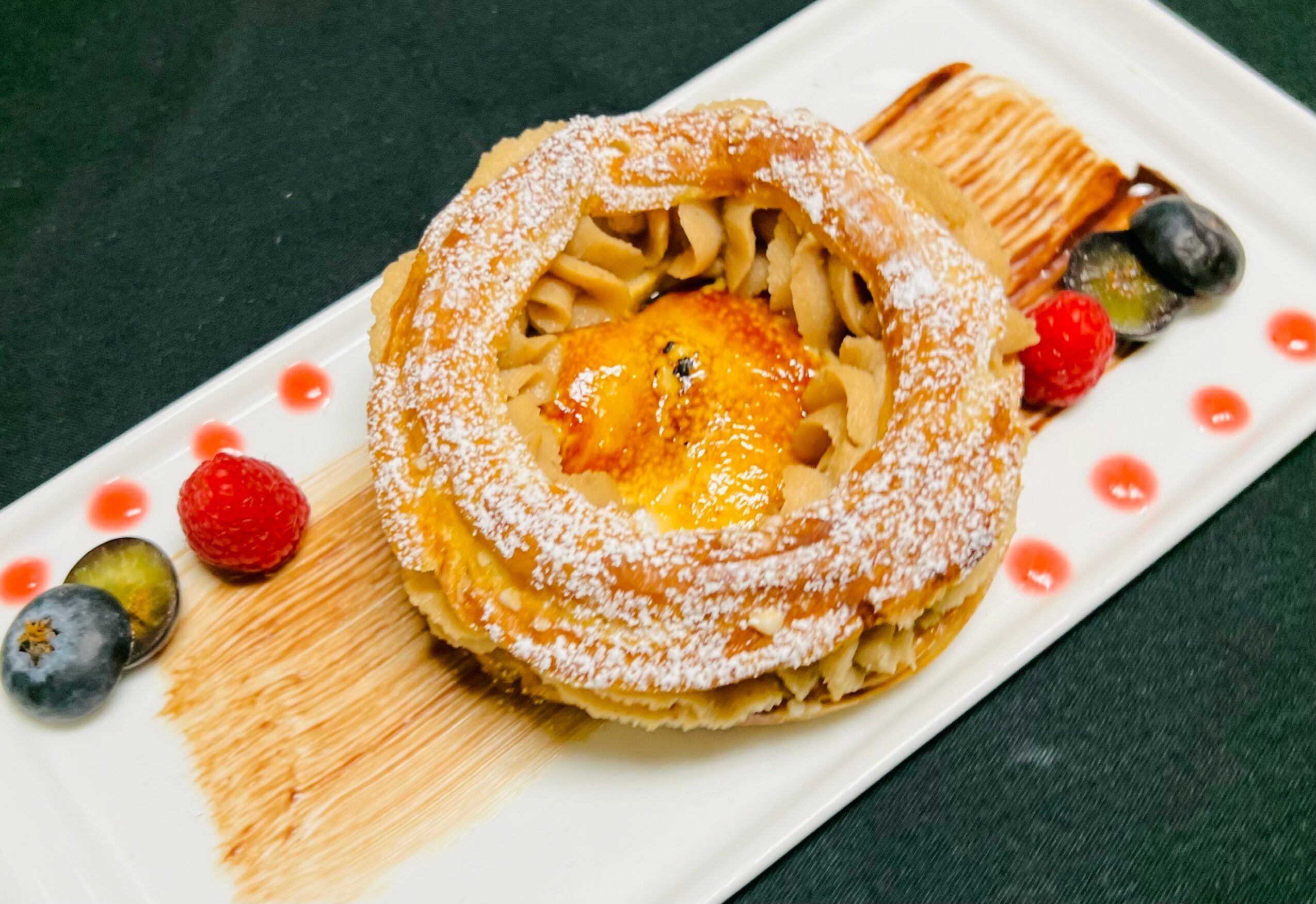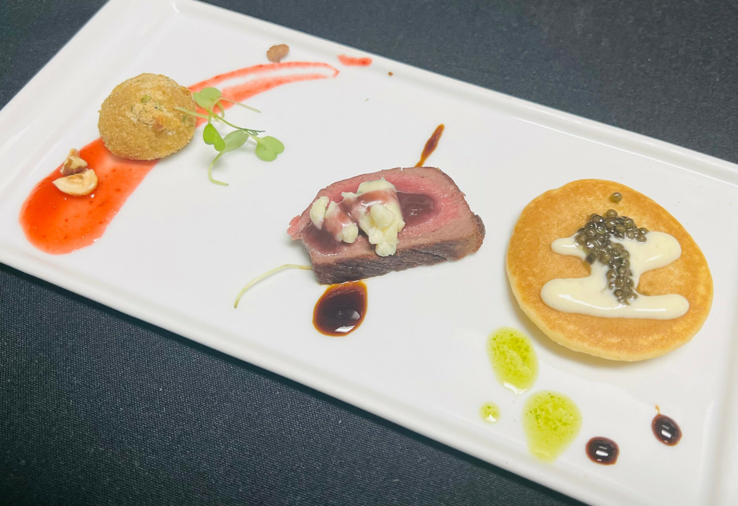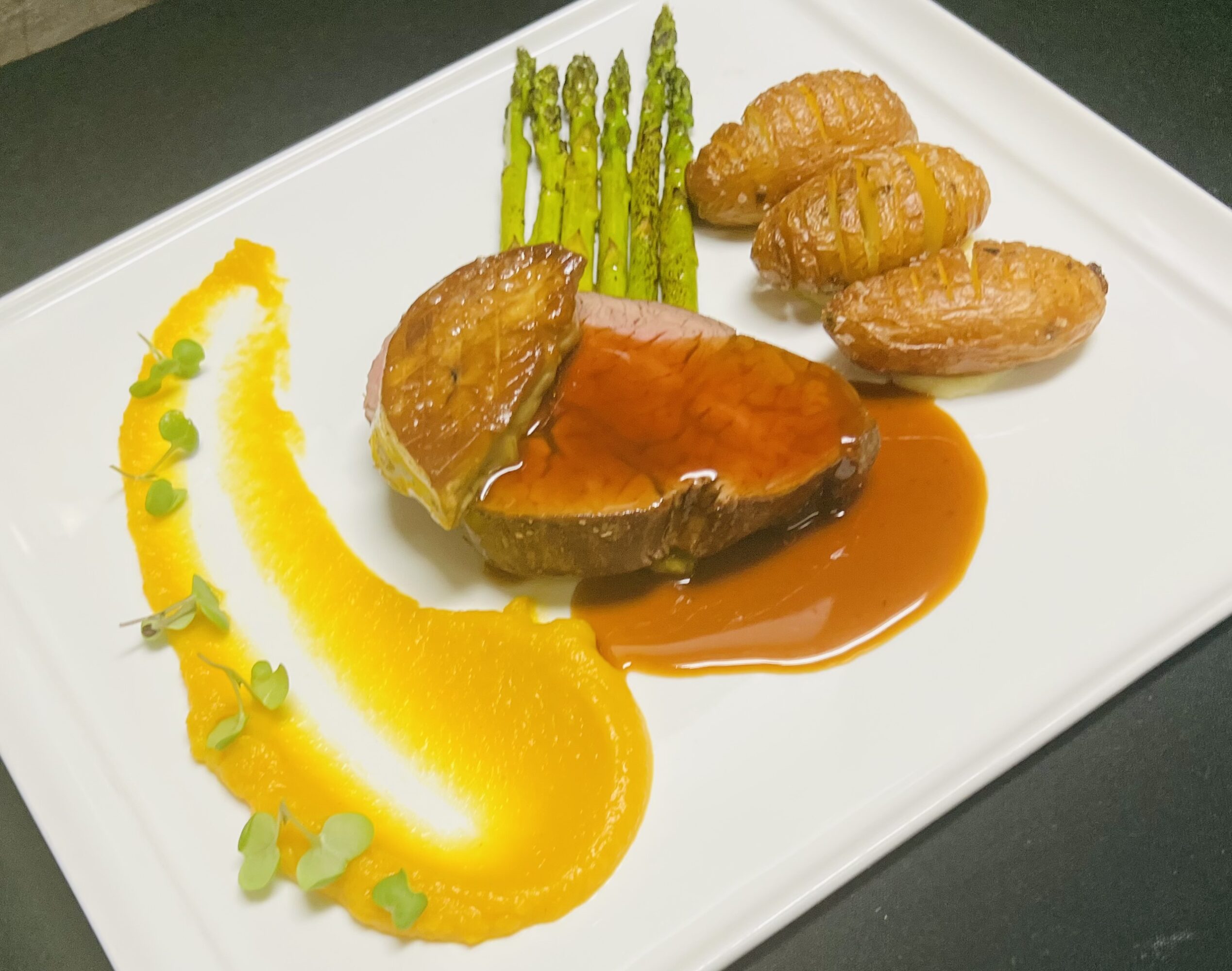 We serve a set menu, starting with plated hors d’ouevres and a glass of sparkling wine. The next course is soup; we always offer lobster bisque, and then switch the vegetarian soup seasonally. We then move onto a seasonal salad, followed by a house-made sorbet intermezzo. For entree, we have 5 options: Tenderloin of Beef, Rack of Lamb, Braised Beef Short Ribs, Duck Breast, and our Fresh Catch of the Day. And then we have three desserts to choose from. We always offer Apple Pie, and then the other two choices change seasonally.
