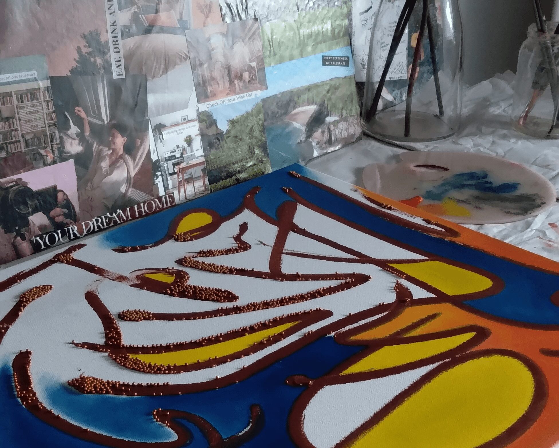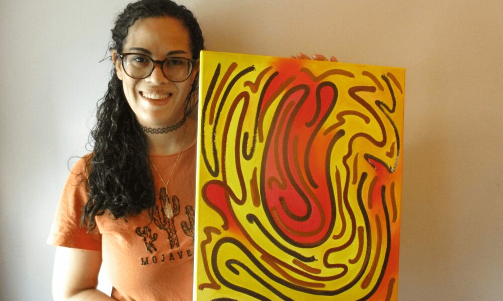 What sets me apart as an artist is my story and my work style; mental health is a big part of my journey. I know I’m not unique in using my art as a way to process and express my emotions, but creating art has always been a major factor in dealing with my mental health struggles. Although I experience anxiety and depression, vibrant color remains a key feature of my work, which seems contradictory when I think about how my art is an outlet for these heavy emotions.