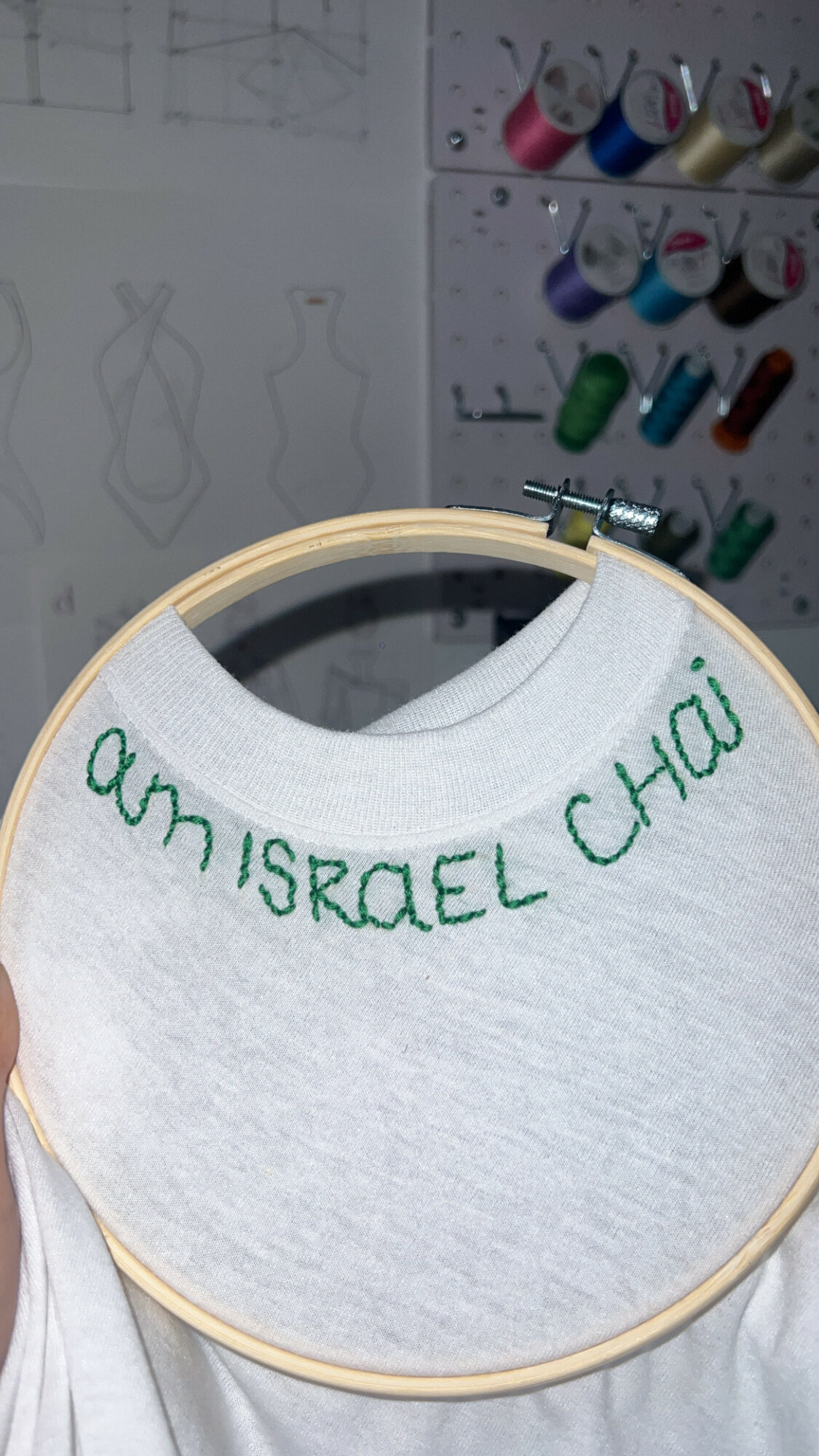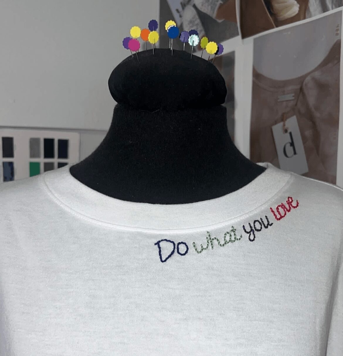 My friend Julia Goncalves who is in the fashion world in Spain inspired me with her hand embroidery, so i decided to embroider phrases on clothing by hand. I reached out to her, and she sent me videos , voice notes on how to embroider by hand and what materials i needed to buy. I remember my first few embroidery attempts weren’t perfect, so i practiced a lot until i achieved the results i wanted .