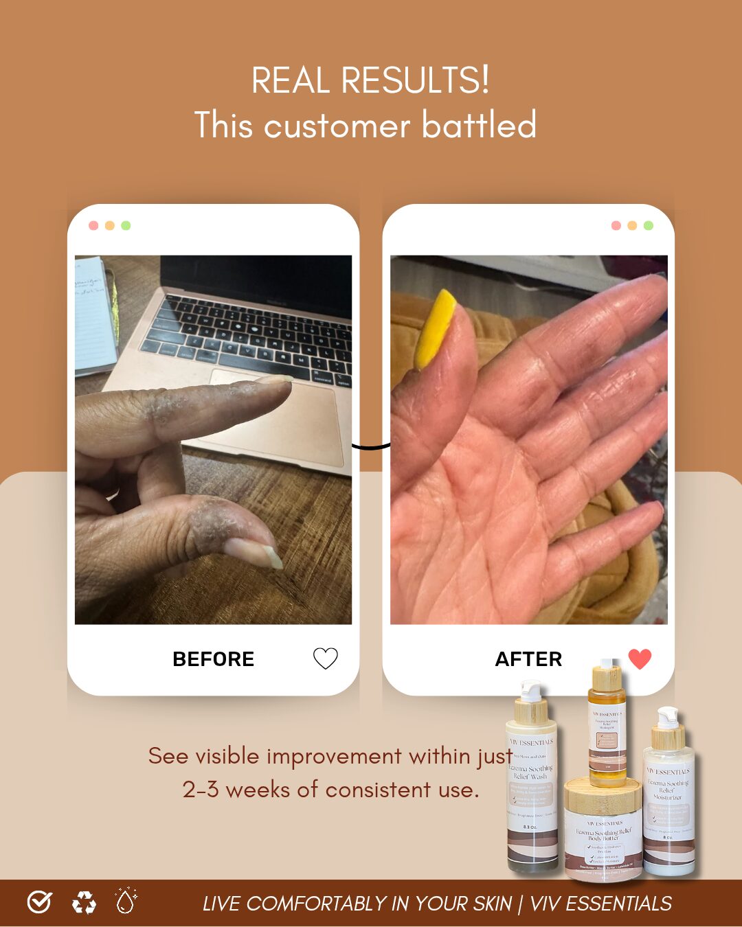 For readers who are just discovering us, I want them to know that Viv Essentials is more than skincare. It’s a brand with heart, intention, and purpose. We’re here to help you heal your skin in the most natural, beautiful way possible. Whether you need relief, hydration, a confidence boost, or a routine you can trust, we’ve created something for you.