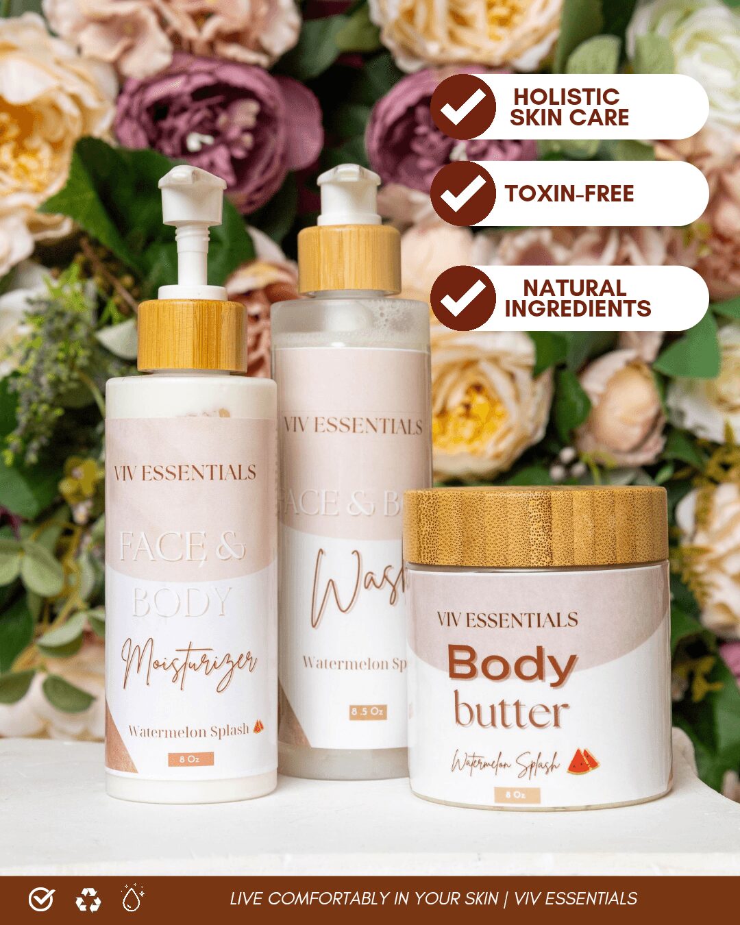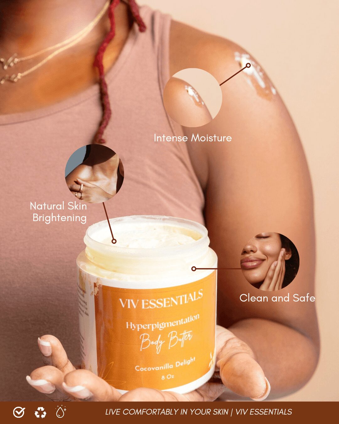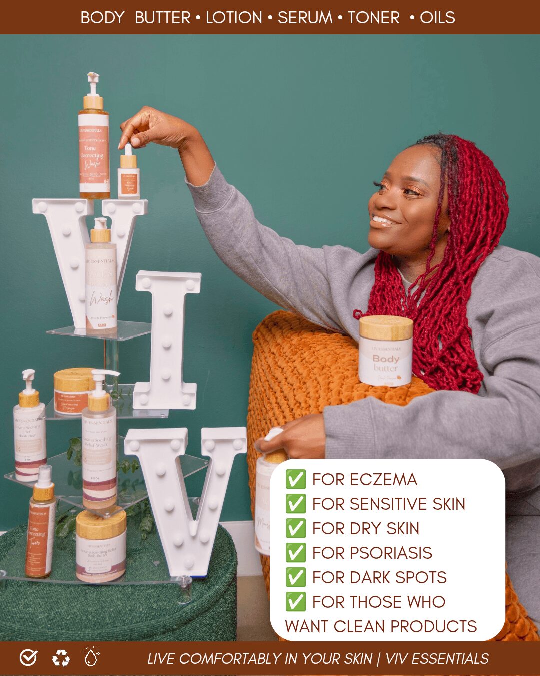 Viv Essentials exists because I wanted people to finally feel comfortable in their skin, naturally, beautifully, and confidently. No compromises. No toxic ingredients. No hidden fillers. Just products made with intention and rooted in real-life experience.