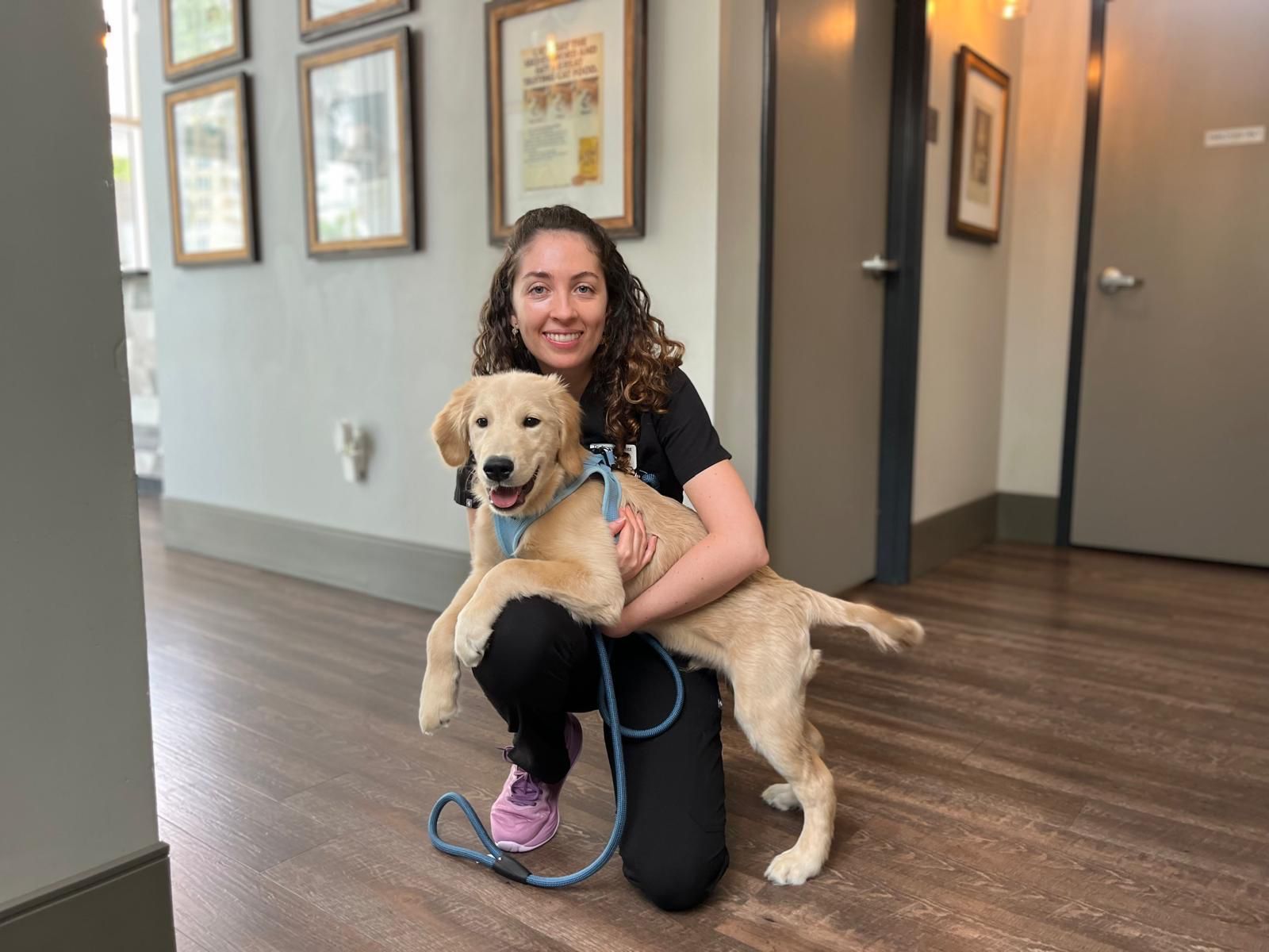 4) Golden retriever puppy –> Dr. Laura supporting her patient after his last set of vaccines. Love and patient comfort are at the core of Wags Animal Hospital
