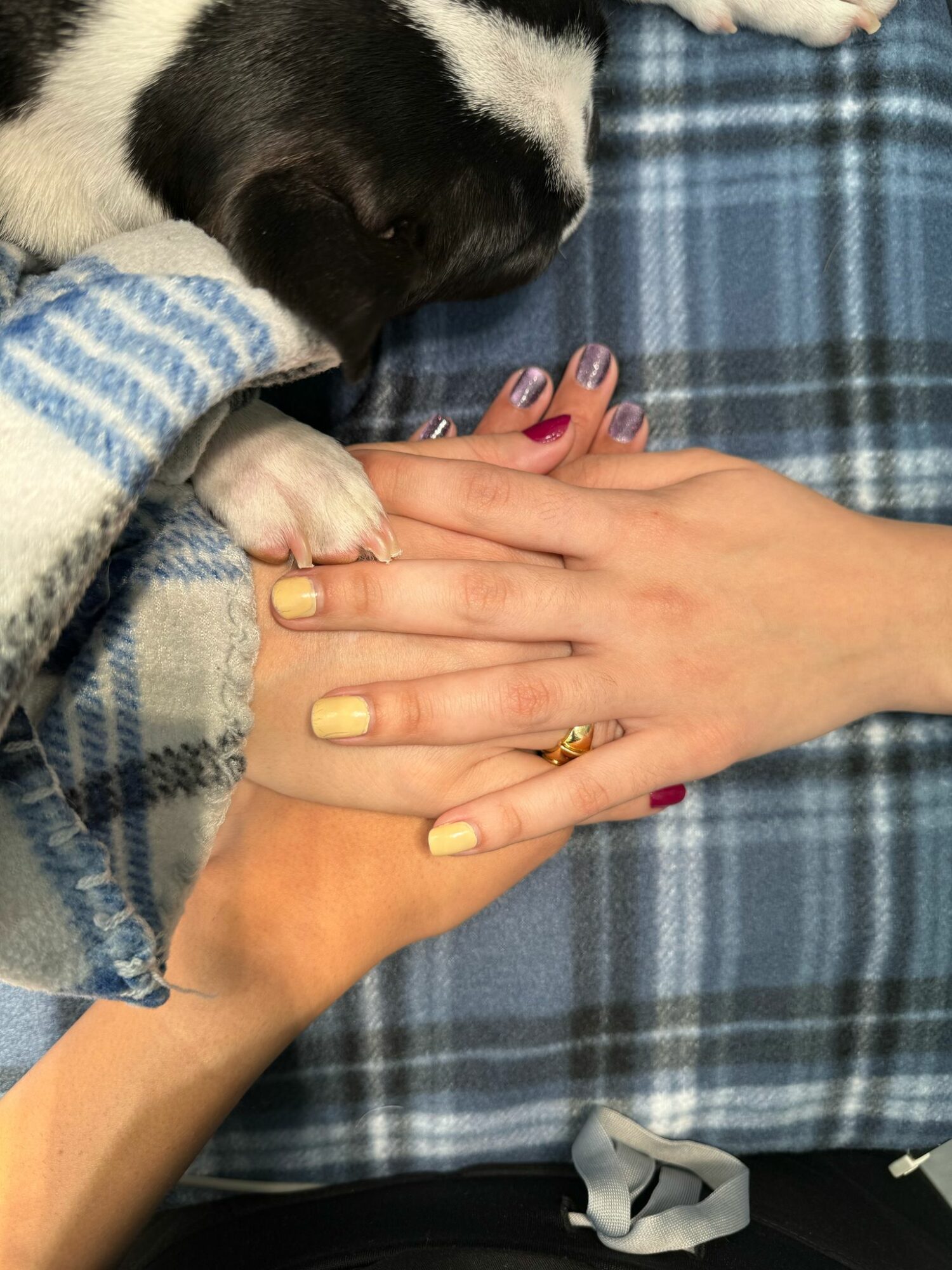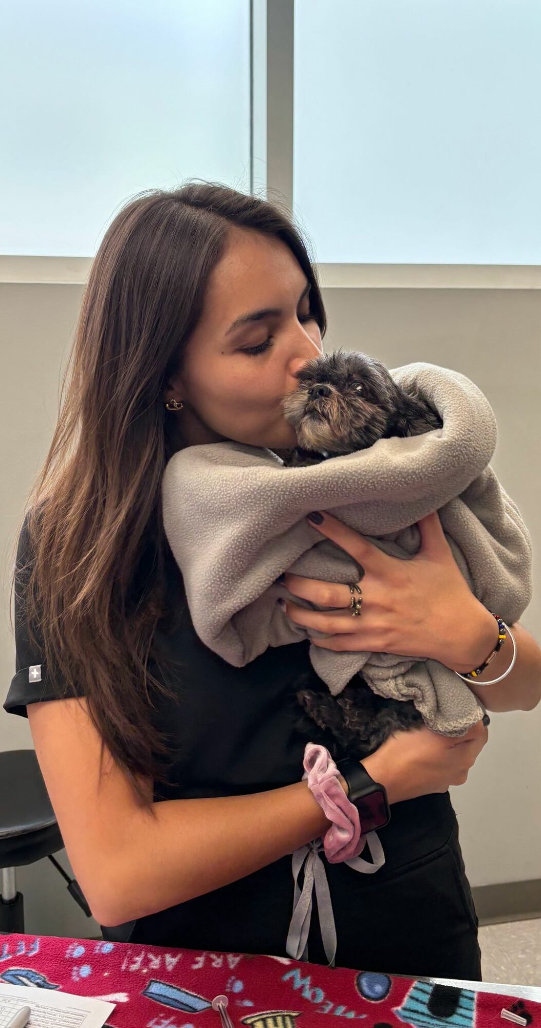 3) Patient wrapped in a blanket –> Dr. Lili helping comfort a patient recovering from a procedure. Love and patient comfort are at the core of Wags Animal Hospital