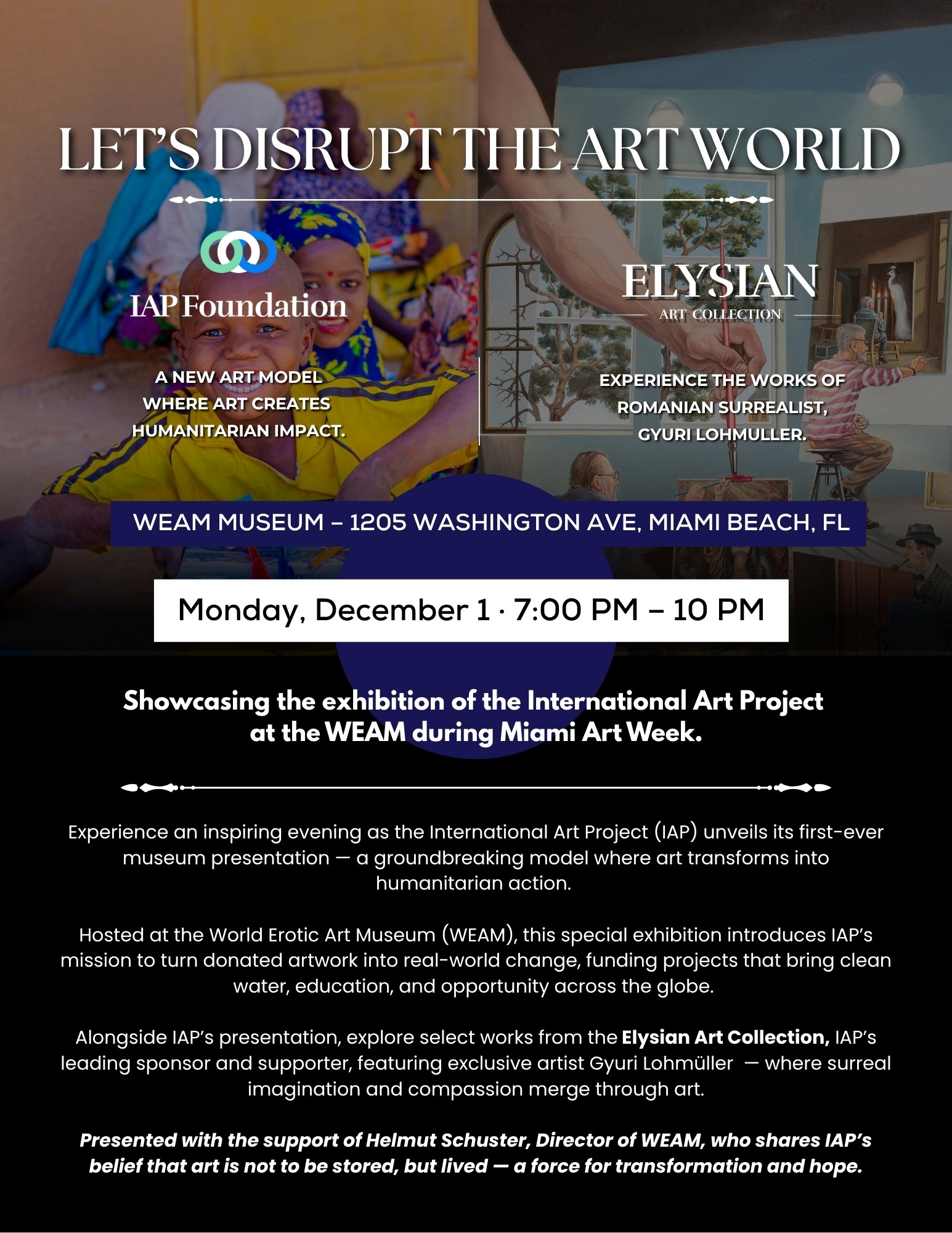 These projects were made possible through the acquisition of artwork — where every donated piece is transformed into direct, tangible change through the International Art Project’s Fine Art Donation Program and the upcoming Exhibition at the WEAM Museum in Miami. I realized that charity wasn’t just about frequent one-time donations—it was about sustainability. After 15 years of collecting art, I saw more than just remarkable works — I experienced the untold stories of their Creators and the power each piece held to deliver clean water, build schools, and empower communities across the globe. For this, I am so committed to our Purpose, shared across the Globe and the impact of which has improved son many lives and created son many opportunities: both artistic and humanitarian.
