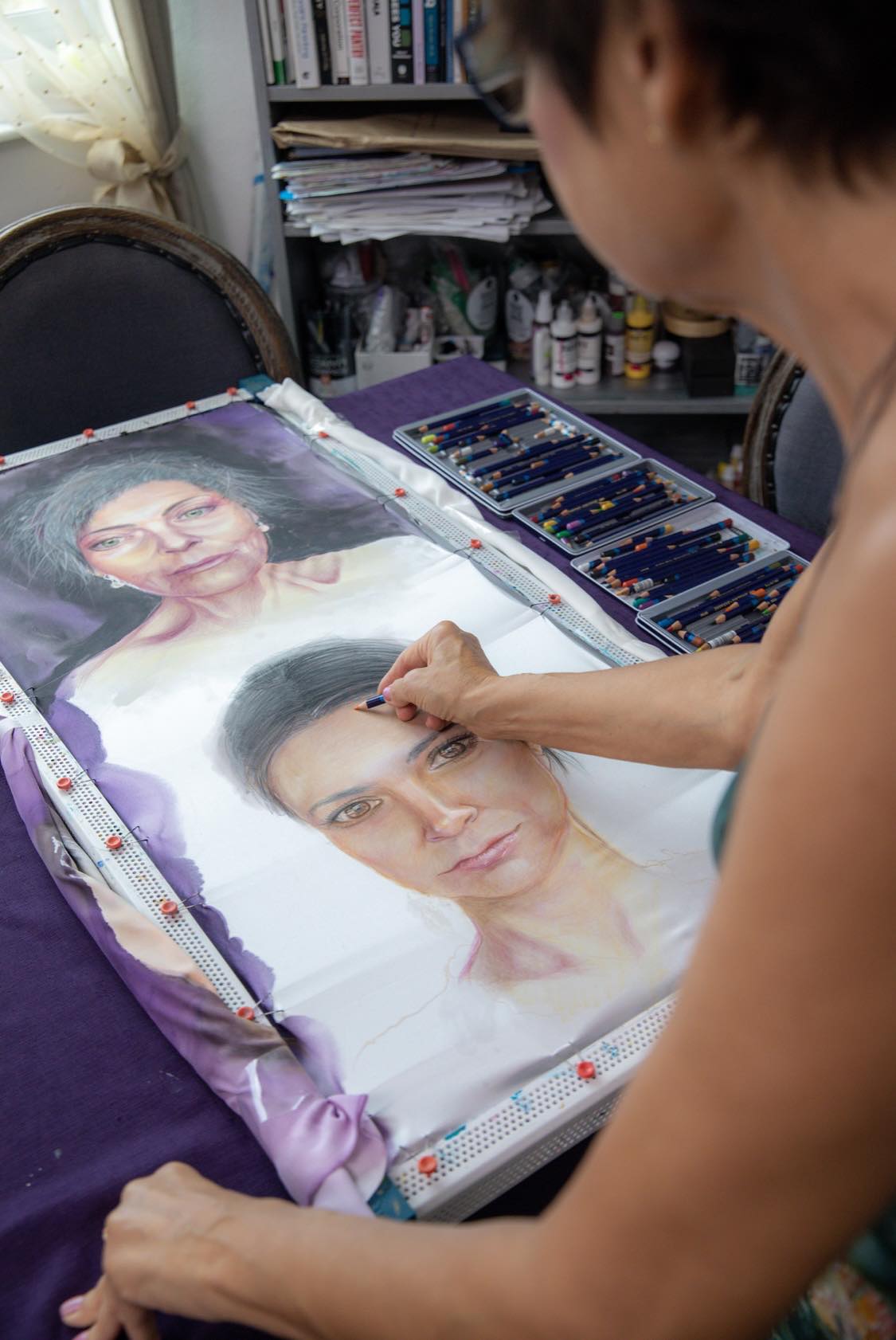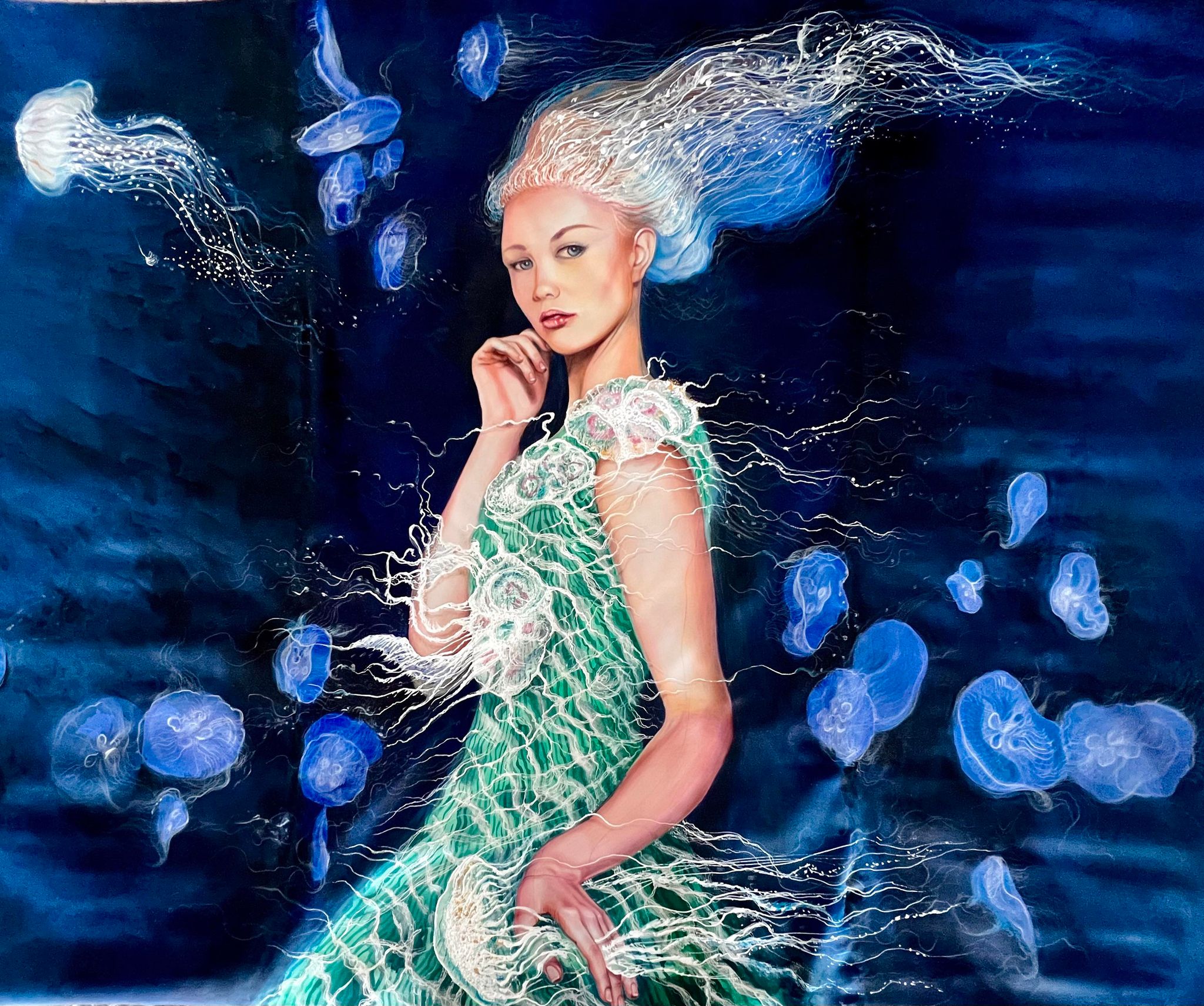 The artist is celebrated for infusing silk with feminine energy. Many of her artworks prominently showcase goddesses and women, highlighting the depth of their eyes and their inner beauty. Her paintings are a celebration of feminine energy, capturing the essence of strength, grace, and mystery that women embody. Violeta’s art invites viewers to explore the depths of the feminine spirit, encouraging reflection and admiration for the beauty and power that reside within.